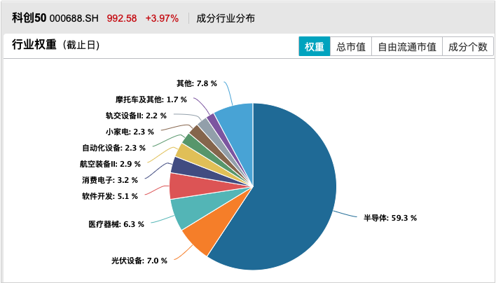 进一步划分,科创50的半导体行业权重占比最高,达到59%。