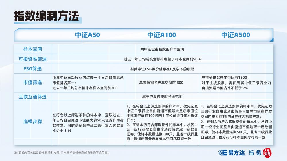具体来看,中证A50、中证A100和中证A500指数在选样时,均会剔除中证ESG评价结果在C及以下的股票,并且要求成份股在沪股通或深股通范围内。同时,这三只指数都会从行业均衡视角反映A股核心龙头公司的表现,只是实现均衡的方法略有差异。