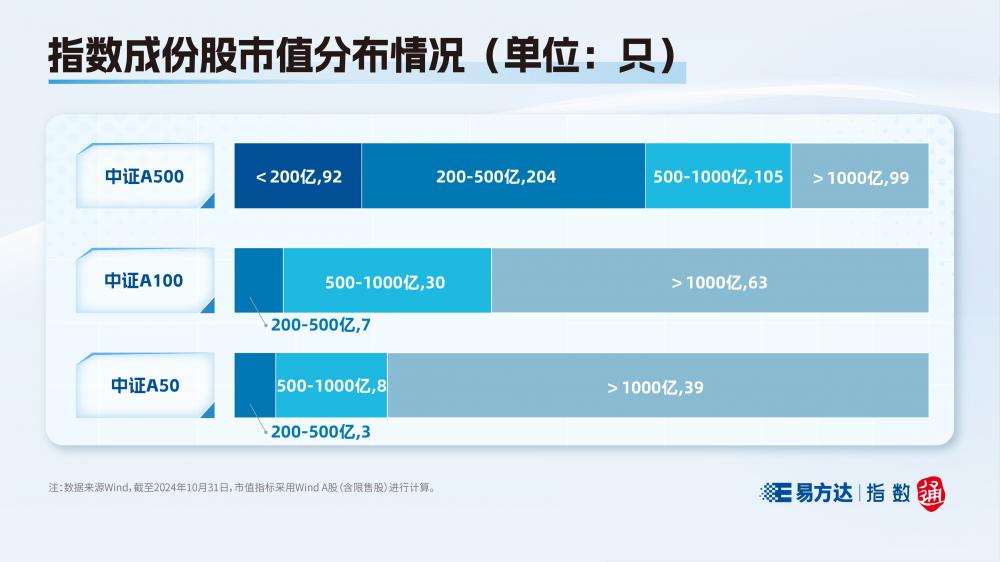从市值分布来看,中证A50、中证A100、中证A500指数成份股的平均市值是逐渐“下沉”的。