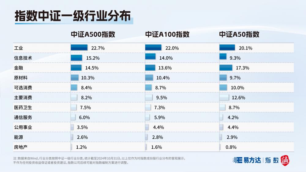 中证A100和中证A500指数的第二、第三大成份行业均为信息技术和金融,权重都在15%左右;而中证A50指数的金融与主要消费行业占比更高。