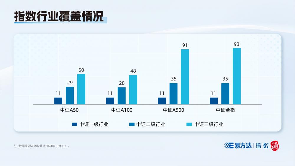 例如,中证A50指数会选取中证三级行业龙头,要求成份股为所属中证三级行业中近一年日均自由流通市值最大的,因此指数覆盖了50个不同的中证三级行业。而中证A100和中证A500指数在分别优选中证二级行业龙头和中证三级行业龙头的同时,还会尽可能使样本一级行业自由流通市值分布与中证全指一致。