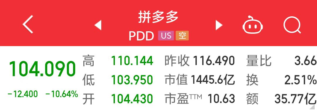受业绩影响,拼多多美股盘前跌幅一度扩大至15%,收跌10.64%。