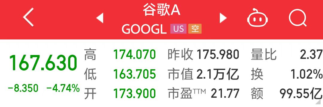 谷歌A收跌4.74%,总市值较上一个交易日蒸发约1022亿美元(约合人民币7396亿元)。