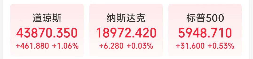 当地时间11月21日,美股三大指数集体收涨,道琼斯指数涨1.06%,报43870.35点;标普500指数涨0.53%,报5948.71点;纳斯达克指数涨0.03%,报18972.42点。