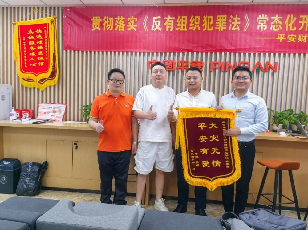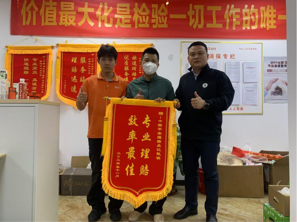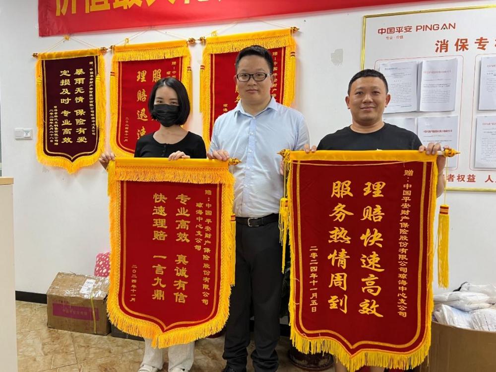 灾前风险排查期间,发现客户车辆属于地势较低地方,平安财险海南分公司摸排人员第一时间通知客户移车至高点。洪水来势凶猛,没想到客户车辆还是被淹了,当天晚上客户着急致电之前摸排提醒人员,在其耐心引导下成功报案。洪水退去后,第一时间邀约客户沟通理赔事宜。深圳分公司理赔员胡鑫专业、高效处理,办理全损理赔后,第二天理赔款就到账了。客户对平安财险高效、贴心的服务很满意,为表示对 对理赔员胡鑫专业、暖心的服务的感谢,2024年11月6日,亲自携带锦旗表达谢意。