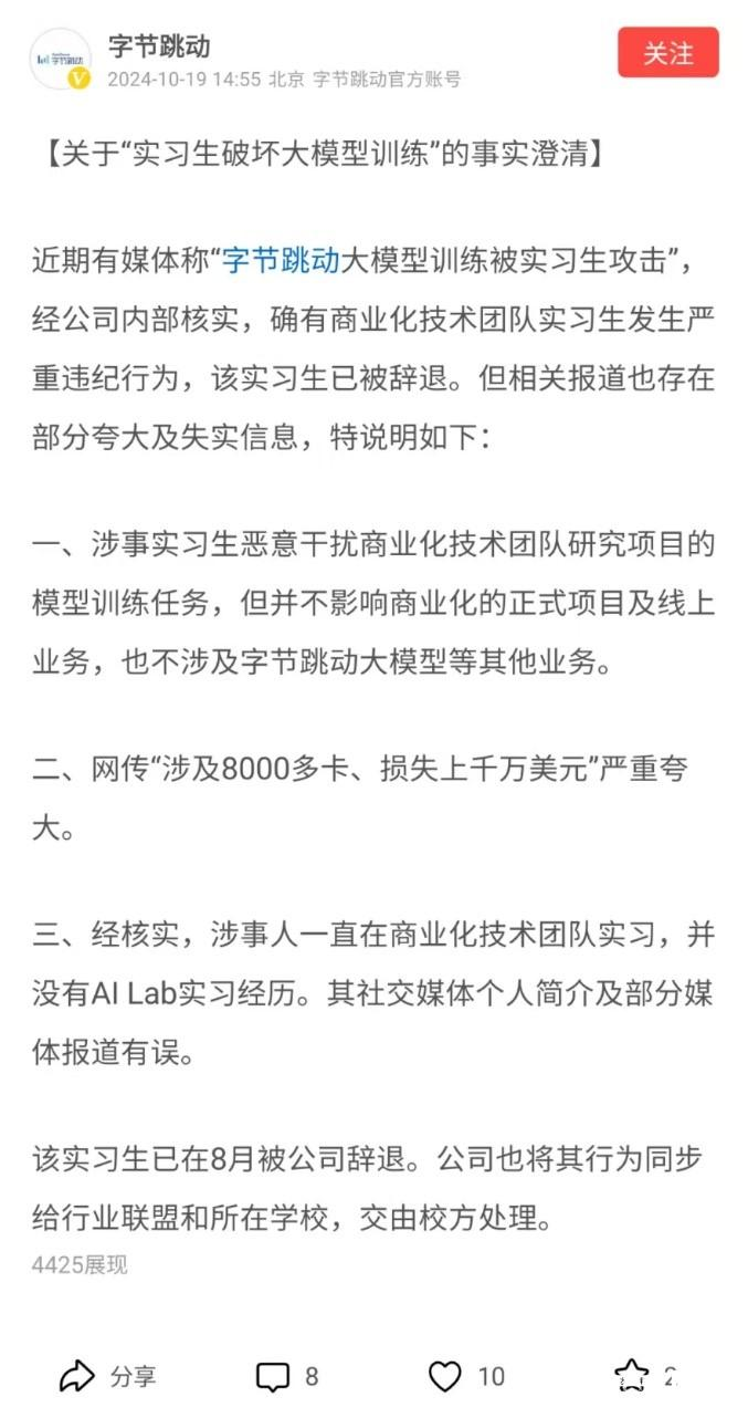 2024年10月,有媒体称“字节大模型训练任务被实习生攻击”,并有网传信息称“涉及8000多卡、损失上千万美元”。后字节跳动通过官方账号发布事实澄清,称确有实习生发生严重违纪,涉事实习生已于2024年8月被公司辞退,并将其行为同步给所在学校和行业联盟,但相关报道也存在部分夸大及失实信息。
