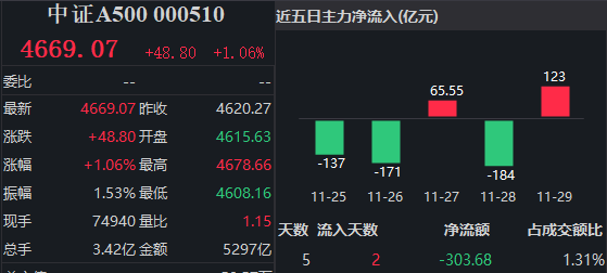 12月2日,市场早盘震荡拉升,午后维持高位震荡,三大指数均涨超1%。中证A500指数(000510.CSI)也大涨1.06%,报4669.07点。成分股中,仅有1只个股跌幅大于4%。