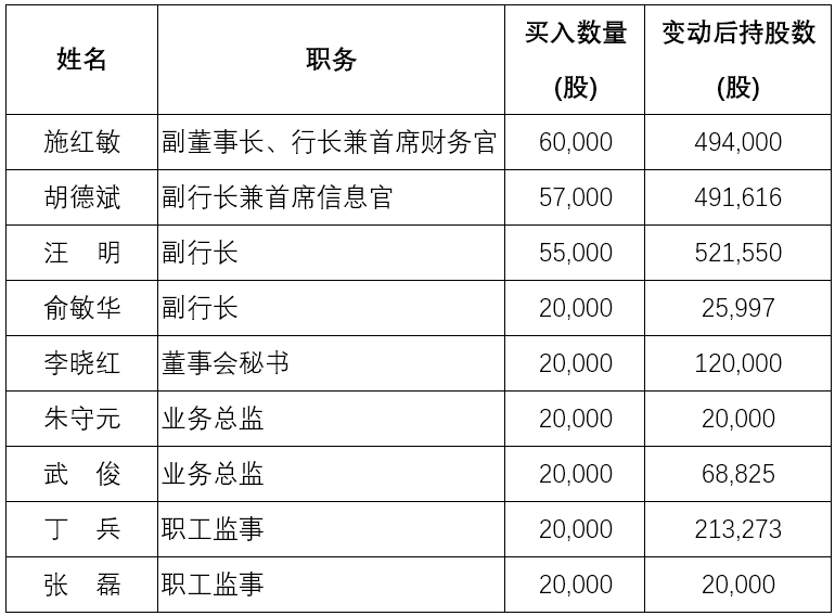 具体来看,上海银行行长兼首席财务官施红敏增持6万股,变动后持股49.40万;副行长兼首席信息官胡德斌增持5.7万股,变动后持股49.16万股;副行长汪明增持5.5万股,变动后持股52.16万股;副行长俞敏华增持2万股,变动后持股2.6万股;董事会秘书李晓红增持2万股,变动后持股12万股;业务总监朱受元增持2万股,变动后持股2万股;业务总监、金融市场部总经理武俊增持2万股,变动后持股6.88万股;职工监事张磊增持2万股,变动后持股2万股;职工监事丁兵增持2万股,变动后持股21.33万股。