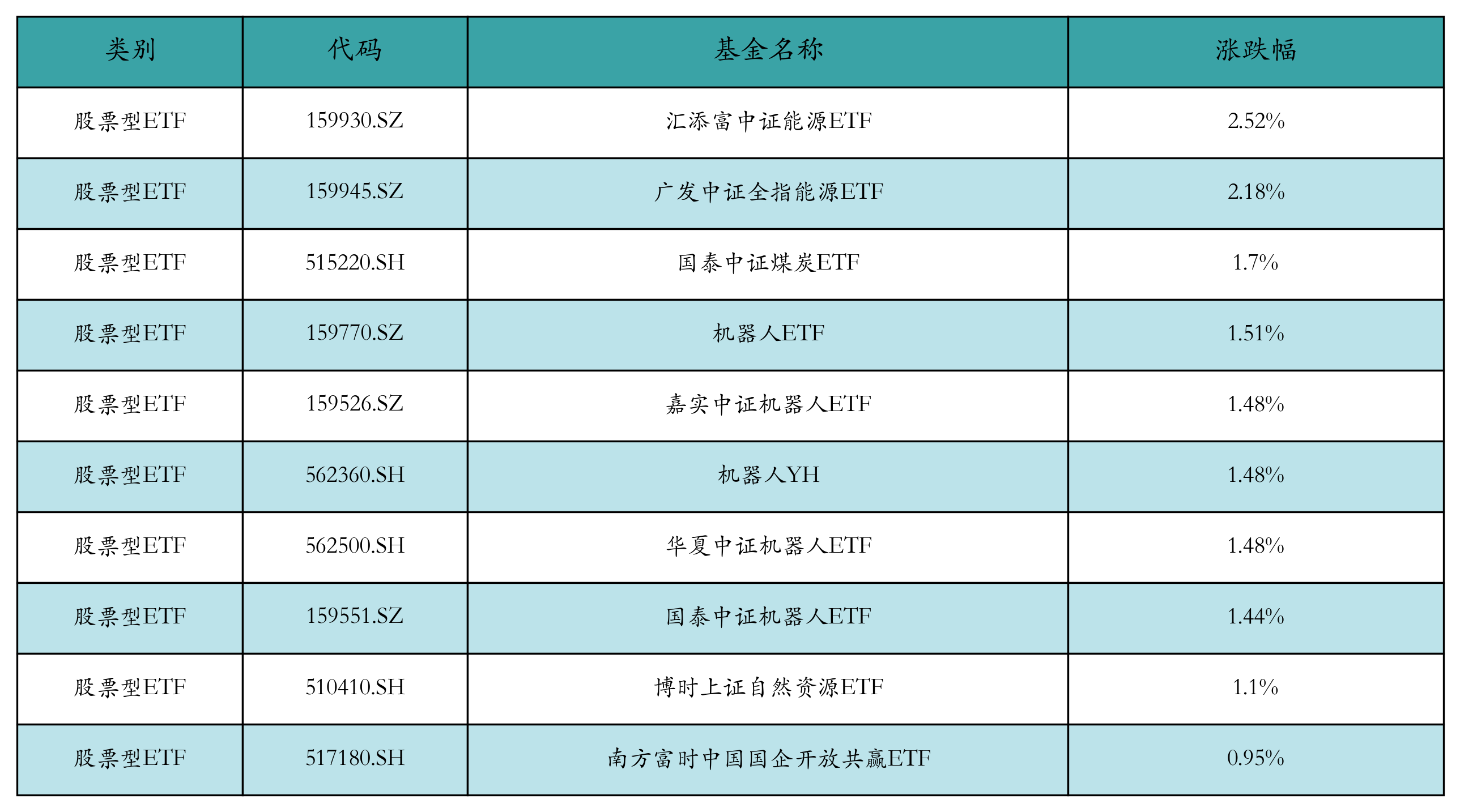 昨日股票型ETF涨幅最高的3支ETF及其收益率分别为:汇添富中证能源ETF(2.52%)、广发中证全指能源ETF(2.18%)、国泰中证煤炭ETF(1.7%)。涨幅前10详情见下表: