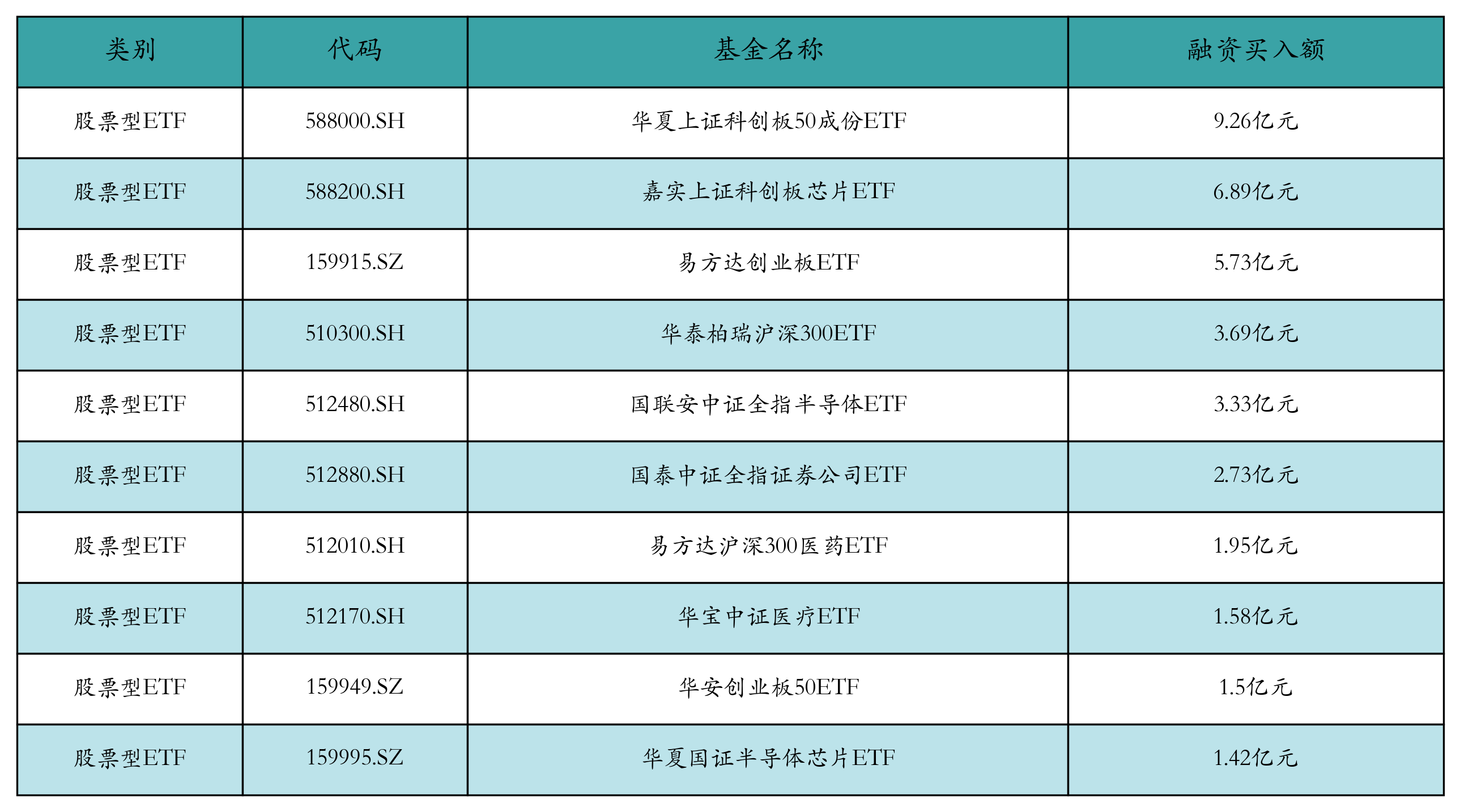 昨日股票型ETF融资买入额最高的3支ETF及其买入金额分别为:华夏上证科创板50成份ETF(9.26亿元)、嘉实上证科创板芯片ETF(6.89亿元)、易方达创业板ETF(5.73亿元)。融资买入额前10详情见下表: