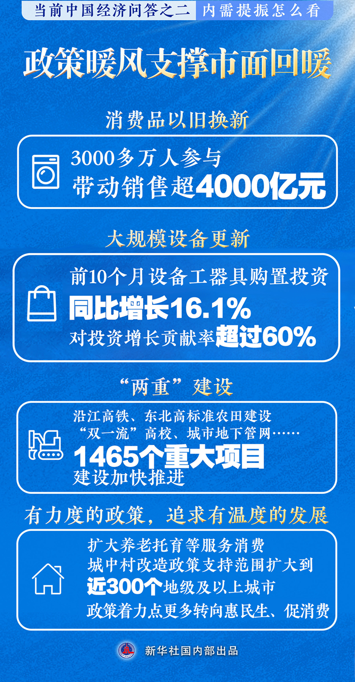 针对经济运行中的新情况新问题,党中央果断决策,一揽子政策协调配合、同向发力,扩内需导向十分鲜明。