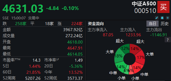 中证A500指数(000510.SH)下跌0.10%,报4631.03点。成分股中,258家下跌,224家上涨,4只个股涨停或涨超10%。