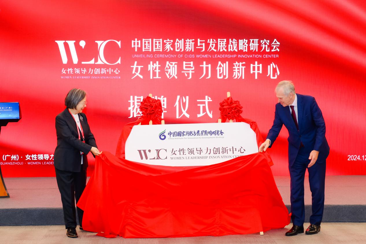 中国国家创新与发展战略研究会会长、中央党校原副校长、国创会女性中心指导委员会主席徐伟新,比利时前首相伊夫·莱特姆在成立仪式现场为国创会女性中心揭牌。