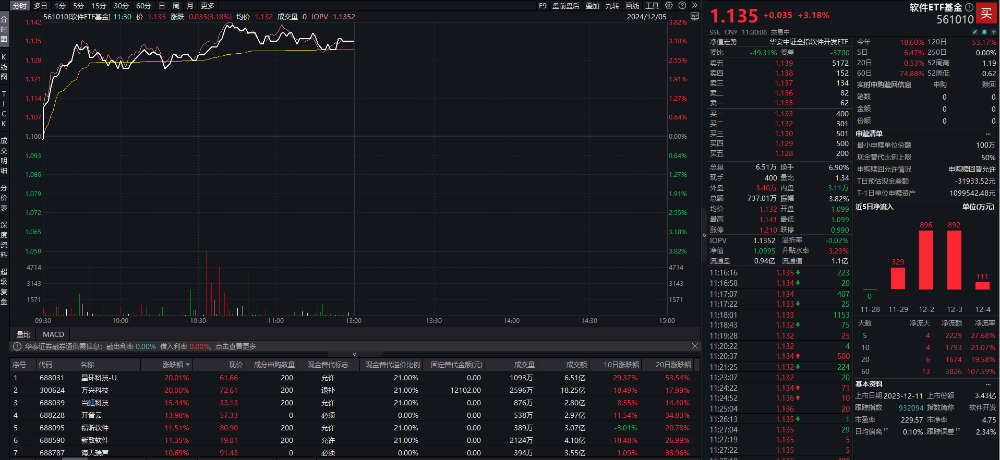 12月5日早盘,人工智能方向表现活跃;相关ETF方面,软件ETF基金(561010)盘中涨幅一度超3.7%。