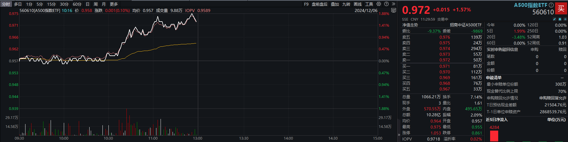 截至午间收盘,中证A500上涨1.67%。相关成分股方面,中公教育、金螳螂、江苏有线涨停,利欧股份、永泰能源、掌趣科技、药明康德、康龙化成等个股涨幅居前。相关ETF方面,A500指数ETF(560610)早盘收涨1.57%,换手率超7%,成交额超10亿元,交投活跃。
