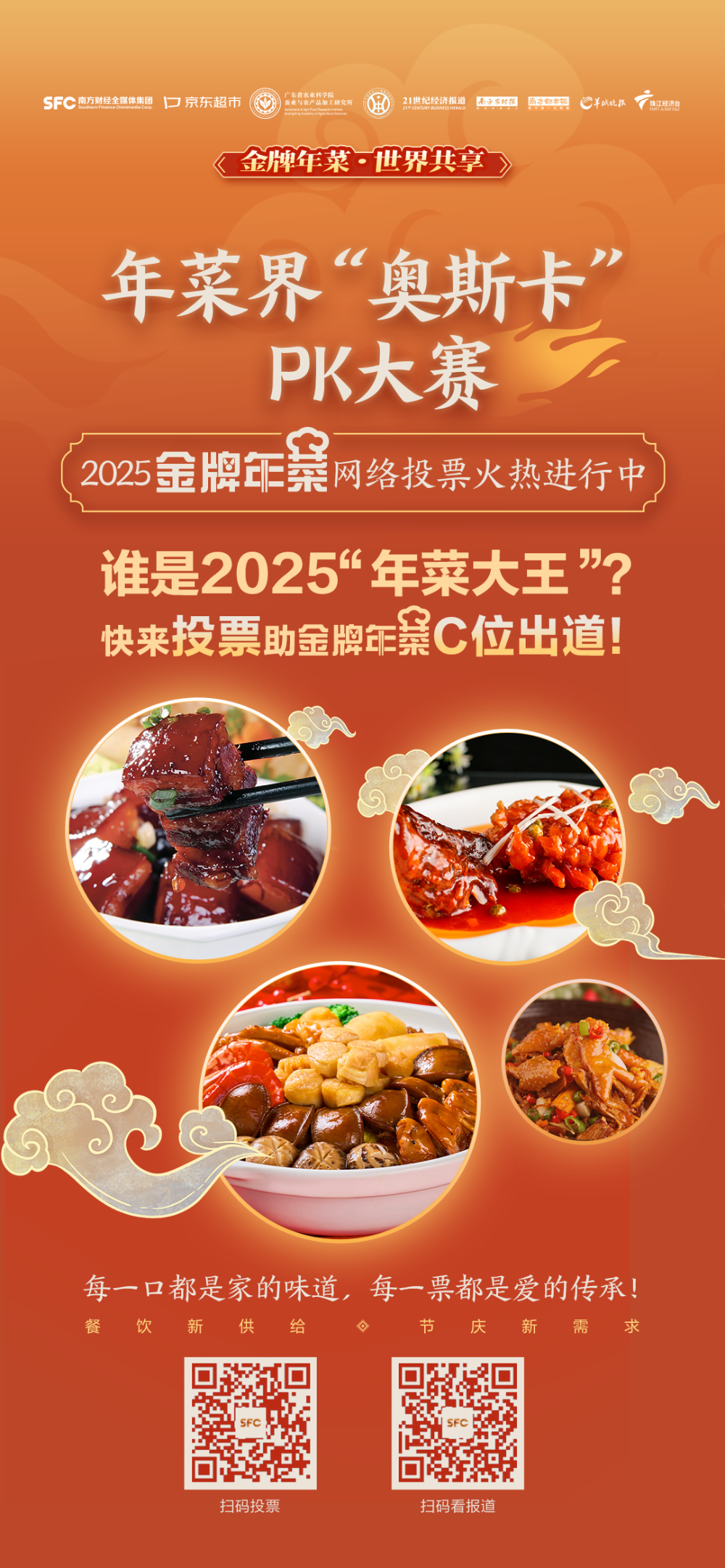 2025“年菜”风云榜巡礼暨第二届“金牌年菜”争霸赛评选已全面启动。本届评选收到了来自全国“世界美食之都”“八大菜系”发源地及其他重要美食城市的280多款参评产品。经过专家筛选,共有183款产品脱颖而出,正式进入大众投票和专家复审环节。目前,大众评选的网络投票通道已全面开启。(投票说明请看文末)