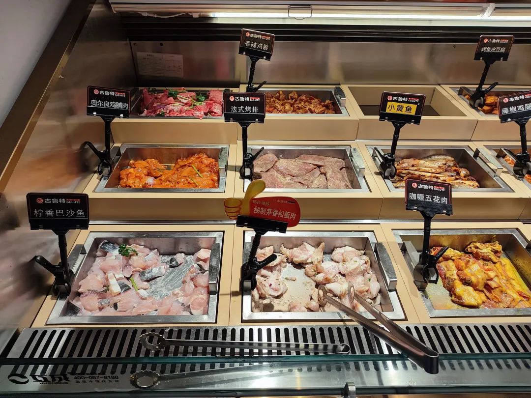 在古鲁特广州首店,红餐网实地探访后也发现,该店肉类食材有20-30种,大部分也都是猪肉或鸡肉,牛肉只有2-3款。且其中一款牛肉是盘装的形式,每盘大约2片,顾客虽然可以无限量拿取,但门店补货的速度并不快,基本刚上新就会被拿空。
