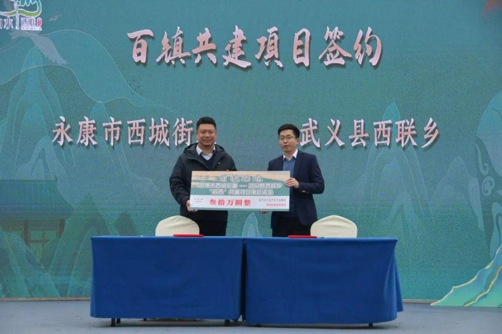 开幕式上,永康市西城街道与西联乡进行结对百镇共建签约,武义县烟草局与河涧村进行农产品认购签约。自2022年5月以来,西联乡与永康市西城街道深入开展“百镇共建”结对活动,以最优服务提振产业发展,累计落实共建资金80万元,举办共富集市27次,带动销售西联乡农户6000余斤农产品,积极推进5个共富项目落地见效,增加村民就业岗位100多个,2024年实现村集体经营性收入30万元以上全部覆盖。