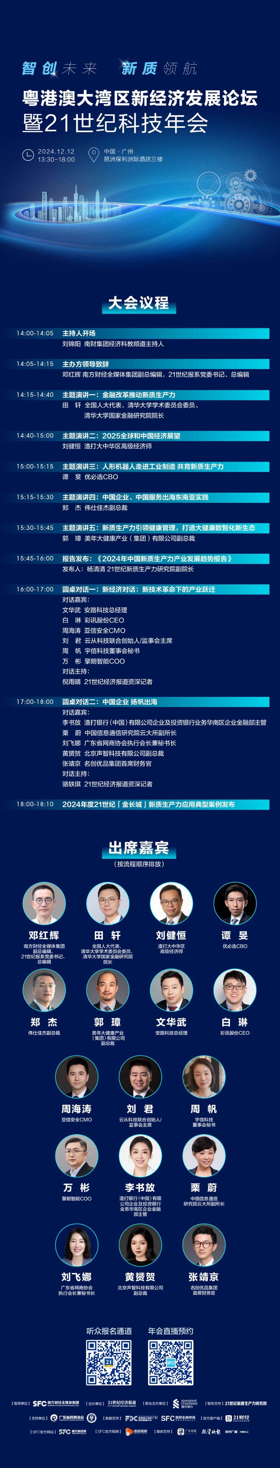 2024年12月12日,由南方财经全媒体集团指导,21世纪经济报道和渣打银行联合主办,由广东省网商协会、广东省机器人协会支持的“粤港澳大湾区新经济发展论坛暨21世纪科技年会”将在广州召开。