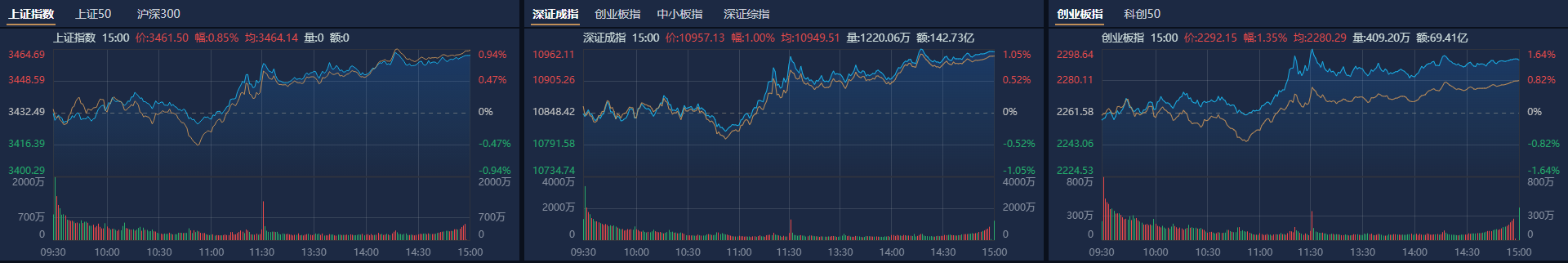 市场全天震荡走高,创业板指领涨。截至收盘,沪指涨0.85%,深成指涨1%,创业板指涨1.35%。