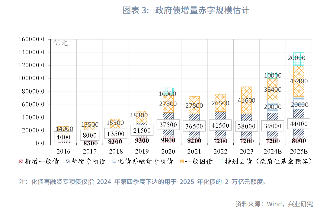 财政政策方面,本次会议要求“要实施更加积极的财政政策”,明确提出“提高财政赤字率,确保财政政策持续用力、更加给力”。相较2023年,此次会议突出“更加”,表明2025年财政力度或有显著提升。在2008年以来的历届中央经济会议中,仅2015年对赤字率提出明确要求“阶段性提高财政赤字率”,2016年我国的财政赤字率达到了3%,这一赤字规模创1949年新中国成立以来之最,赤字率也首次碰触了3%。[1]预计2025年赤字率或将首次达到4.0%或以上,政府债券增量或将明显提升。假设预算隐含的名义GDP同比为 6.0%(预算隐含的名义GDP同比可能高于实际值), 赤字率4.0%的情境下,对应赤字规模约为5.5万亿元,较2024年约增加1.5万亿元;超长期国债规模或达2万亿元及以上,较2024年约增加1.0万亿元及以上;专项债规模或在4.4万亿元及以上,较2024年约增加0.5万亿元及以上。