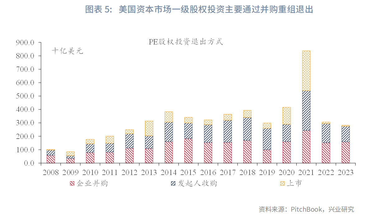 第四,深化资本市场投融资综合改革。会议要求,“深化资本市场投融资综合改革,打通中长期资金入市卡点堵点,增强资本市场制度的包容性、适应性”。随着指数基金纳入个人养老金产品目录,资本市场的中长期资金来源得到拓宽。与此同时,深化投融资改革有助于实现A股投融资的动态平衡,为股票市场长期稳健发展筑牢基础。股权投资退出渠道相对单一是影响A股投融资平衡的重要挑战,而并购重组有助于丰富退出渠道,是深化资本市场改革的重要抓手。我国资本市场一级股权投资主要通过被投企业IPO退出,2019—2023年的交易占比为61.41%。相比之下,美国资本市场一级股权投资较大部分通过被投企业并购重组实现退出,IPO对股票市场的资金占用较少。近期深圳、上海等地先后出台并购重组相关政策,提出了储备并购标的、协助开展并购资源整合和投后赋能、提升专业机构服务能力、搭建综合性公共服务平台等一系列配套措施,有望形成良好的示范带动效应,掀起各地支持并购重组的小高潮。