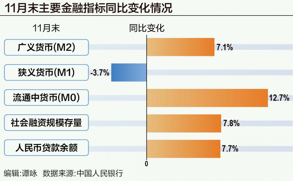 央行数据显示,11月末,广义货币(M2)余额311.96万亿元,同比增长7.1%。狭义货币(M1)余额65.09万亿元,同比下降3.7%。流通中货币余额12.42万亿元,同比增长12.7%。