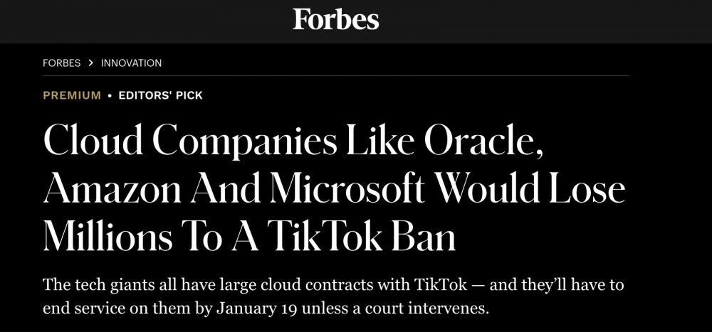《福布斯》报道:受TikTok封禁令影响,甲骨文、亚马逊、微软等云服务公司将损失惨重。
