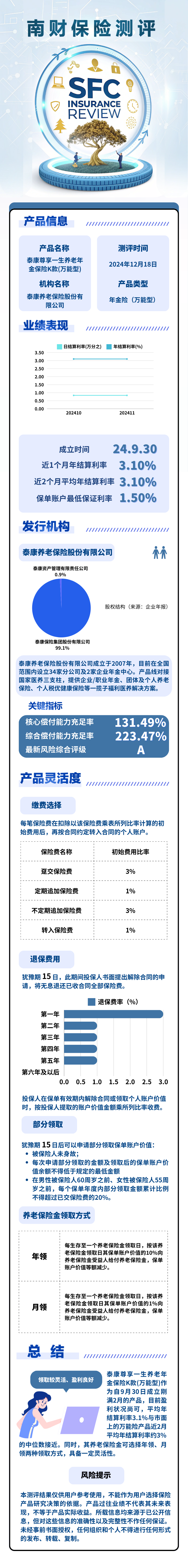 个人养老金产品测评:泰康尊享一生养老年金保险K款(万能型)平均年结算利率3.1%|南财养老金融测评