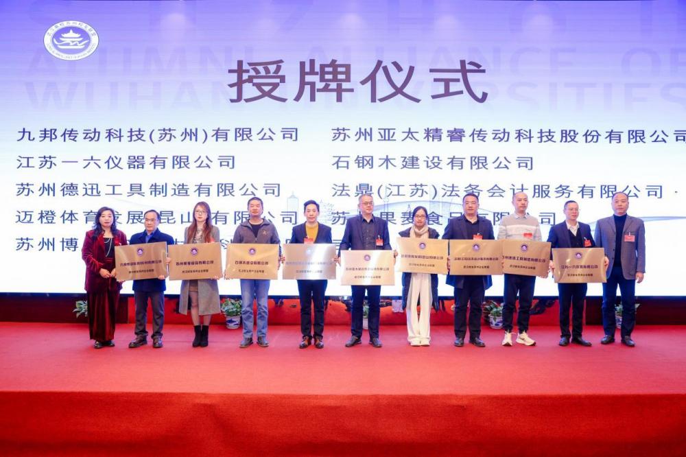 演讲环节结束后,大会特别举行了武高联会员单位授牌仪式,九邦传动科技(苏州)有限公司、江苏一六仪器有限公司、苏州德迅工具制造有限公司、迈橙体育发展(昆山)有限公司、苏州博恩希普新材料科技有限公司、苏州亚太精睿传动科技股份有限公司、石钢木建设有限公司、法鼎(江苏)法务会计服务有限公司、苏州果麦食品有限公司等九家优质武汉校友企业加入企业家联盟。