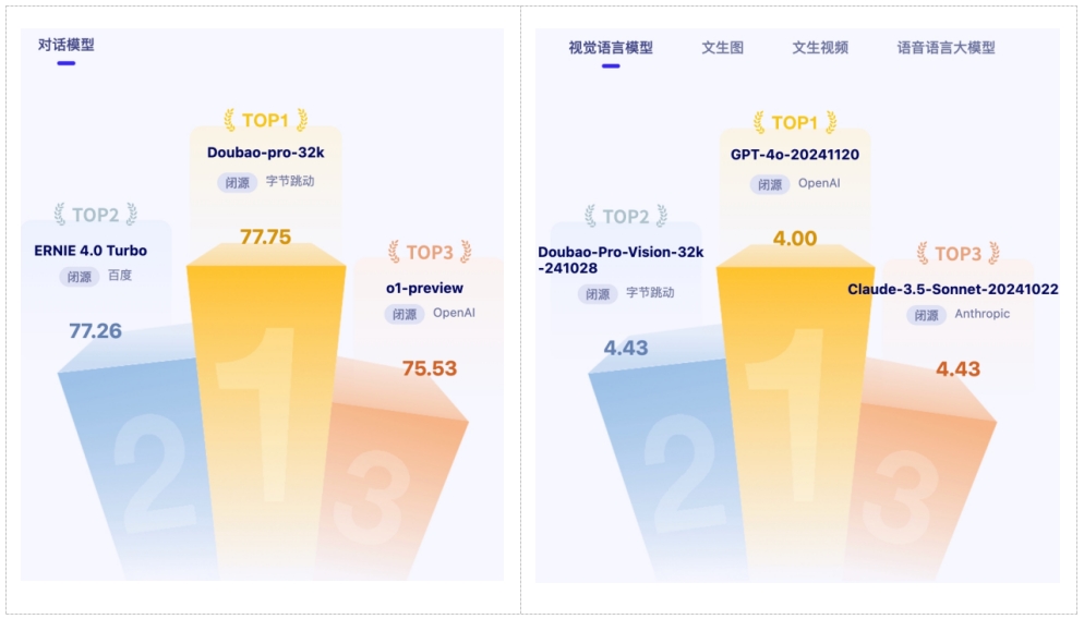 12月19日,智源研究院发布最新一期大模型综合及专项评测结果。在覆盖国内外100余个开源和商业闭源大模型的评测中,豆包通用模型pro获得大语言模型主观评测最高分;在多模态模型评测中,豆包视觉理解模型排名视觉语言模型第二,成绩仅次于GPT-4o;豆包文生图模型、豆包视频生成模型(即梦P2.0 pro)也分别在相应测试中获得全球第二。