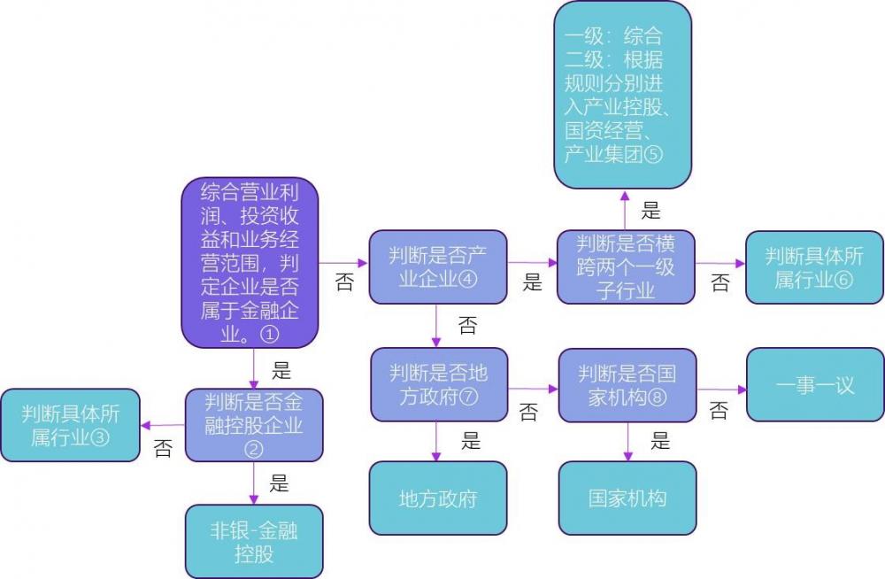 金融板块专注于资金管理和投融资业务,受严格监管,业务需持牌;产业板块涉及实体制造、生产和销售等活动。两板块风险差异明显,易与金控和产业集团混淆。因此,判定流程首步是区分金融或产业主体,特征不明确或混合的主体在排除政府和国家机构后,将进入一事一议流程,确保多元金融、金融控股等主体得到合理区分。