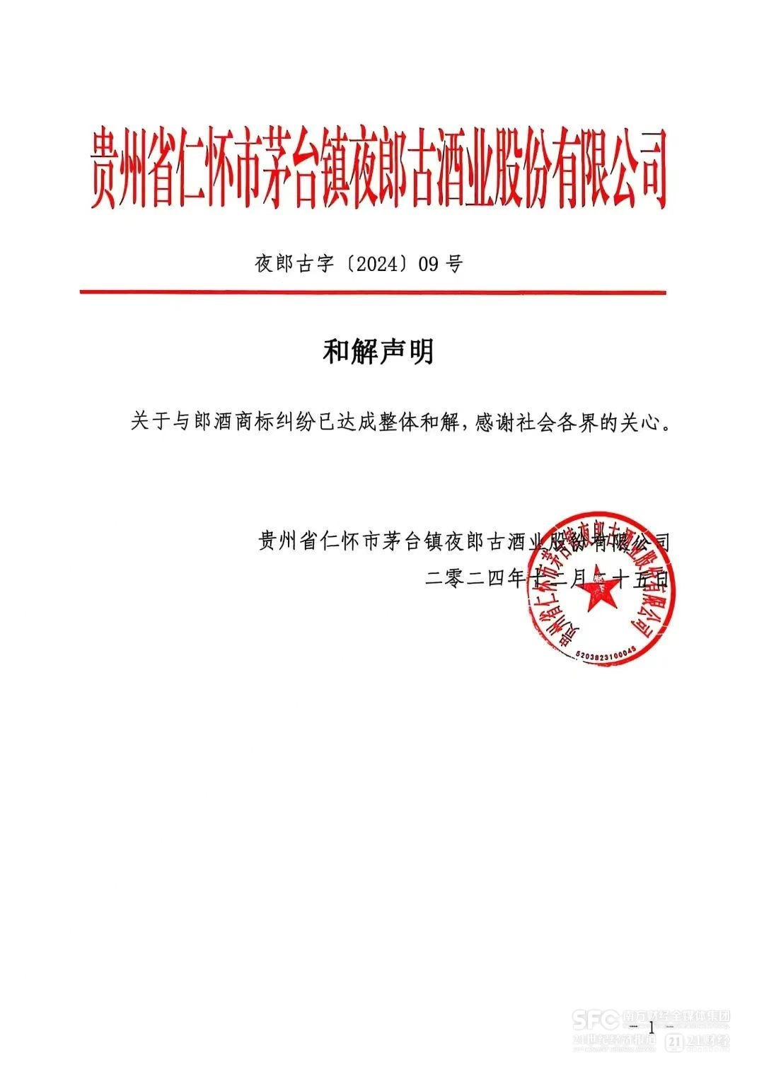 12月25日,夜郎古酒官微发布《和解声明》,称关于与郎酒商标纠纷已经达成整体和解。