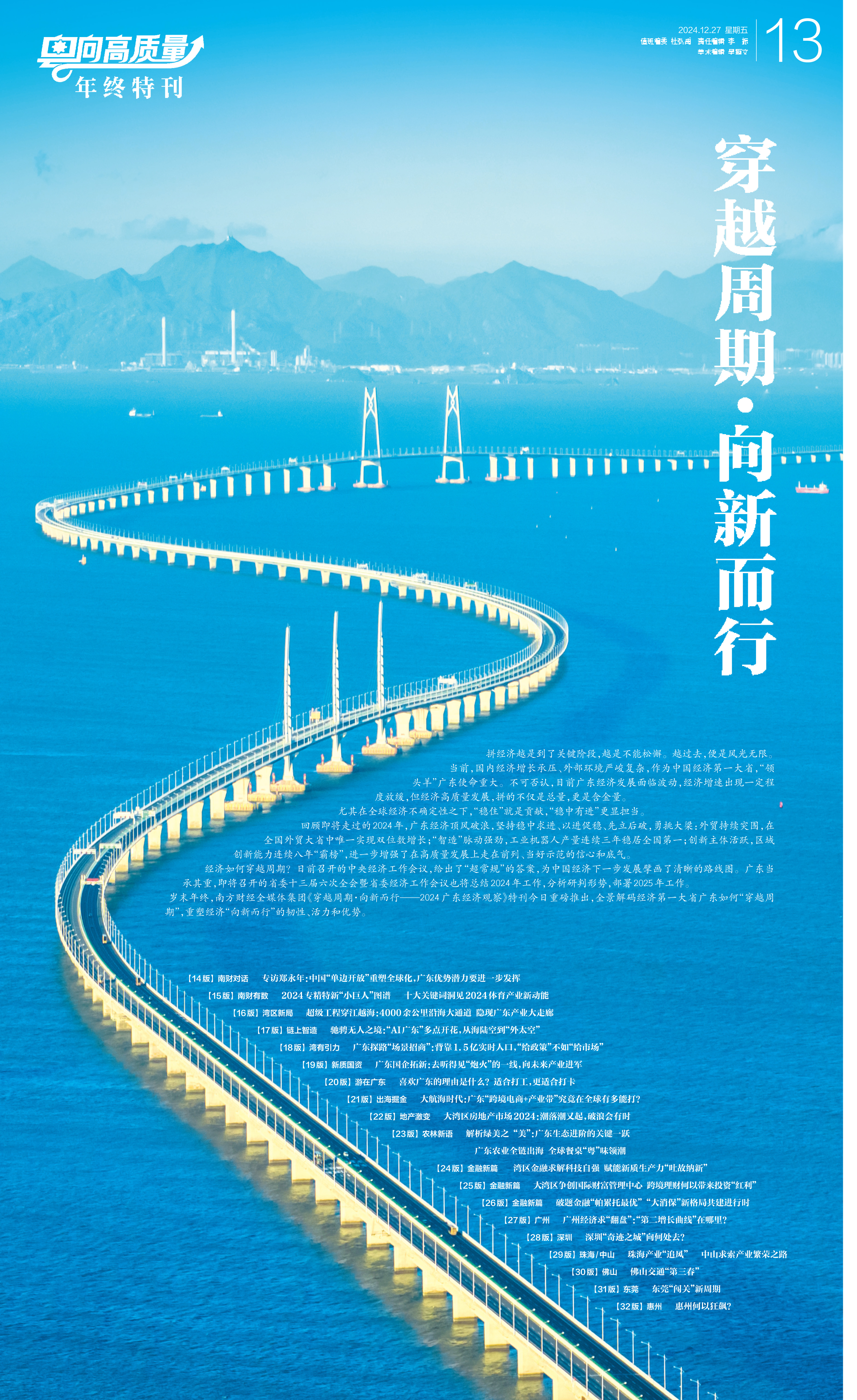 岁末年终,南方财经全媒体集团《穿越周期·向新而行——2024广东经济观察》特刊今日重磅推出,全景解码经济第一大省广东如何“穿越周期”,重塑经济“向新而行”的韧性、活力和优势。