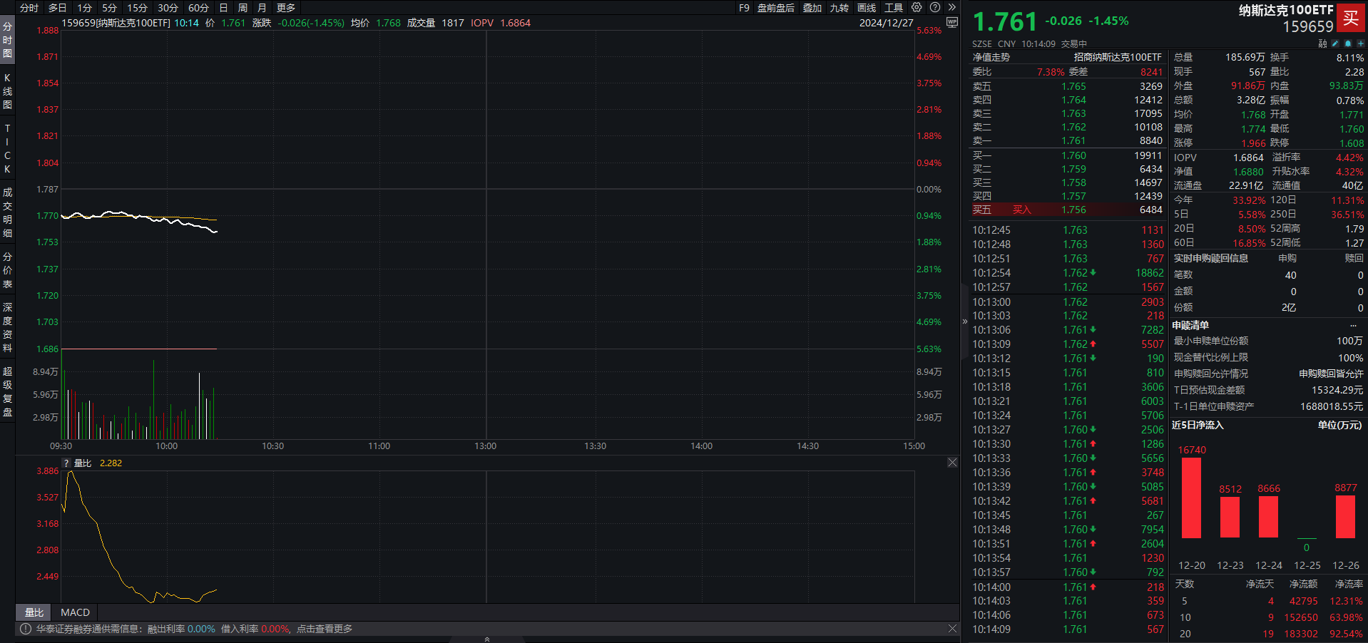 资金流向方面,据Wind金融终端数据,12月26日纳斯达克100ETF(159659)单日净申购超8800万元,近一个月获资金净流入超19亿元;该产品最新流通份额为22.91亿份。