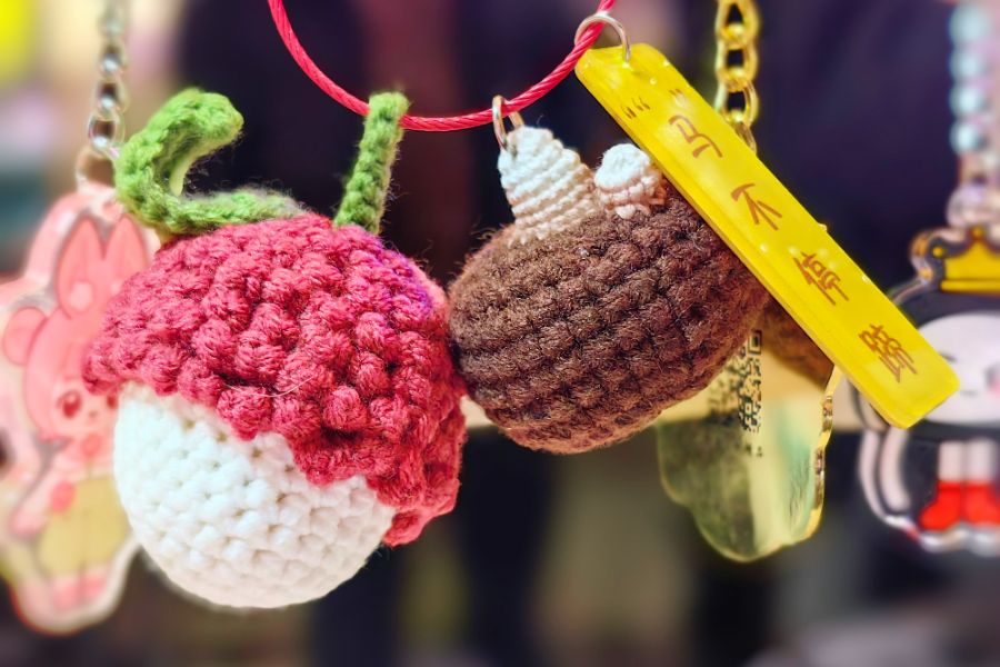 (融合当地文化元素的朗乐毛织袋和荔枝马蹄文创钥匙扣。主办方供图)