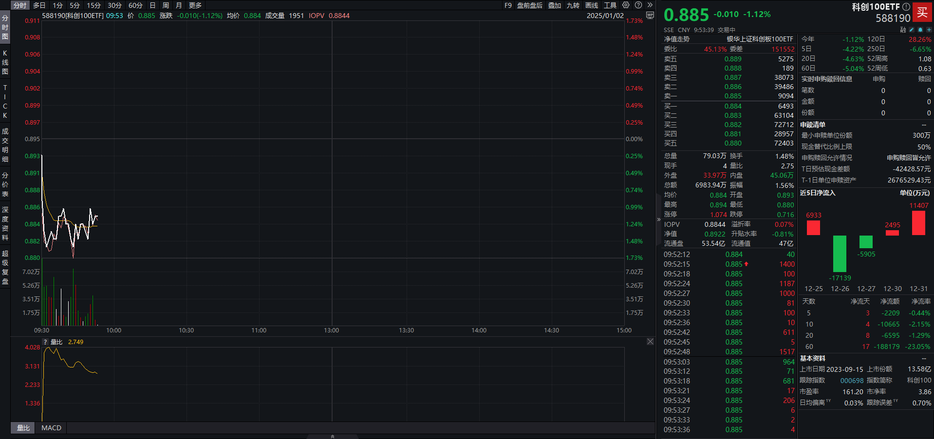 1月2日,三大指数集体低开,高速连接器、算力租赁等板块指数跌幅居前。截至发稿,科创100ETF(588190)跌幅超1%,溢折率0.07%,盘中频现溢价交易,成交额近7000万元。