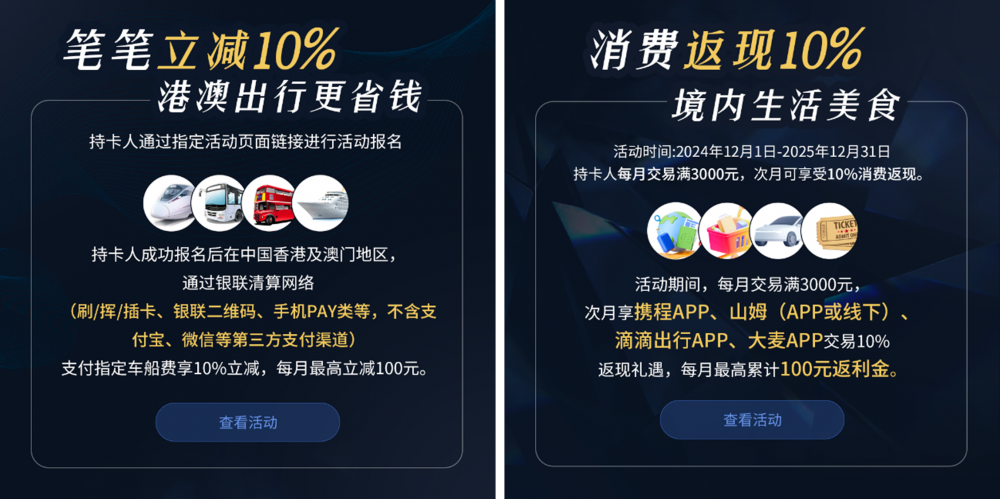 据介绍,中信银行首次推出的大湾区主题信用卡——中信银行信运无界信用卡(大湾区版)为持卡用户提供了港澳出行、生活美食等丰富的消费支付立减及返现优惠。活动期间,持卡用户在指定活动页面报名,通过银联清算网络(刷/挥/插卡、银联二维码、手机PAY类)指定支付渠道,在澳门、香港地区即可获享公共交通费用立减10%优惠,让用户港澳出行更省钱。同时,消费达标的持卡用户还可获得在携程旅行、滴滴出行、大麦、山姆等商户10%消费返现,满足在大湾区旅游出行、娱乐演出、民生消费等多场景消费需求。此外,用户还可获得多项优惠活动和权益保障,包括刷卡交易免年费、航班延误保障险、航意险、盗刷保障险等。