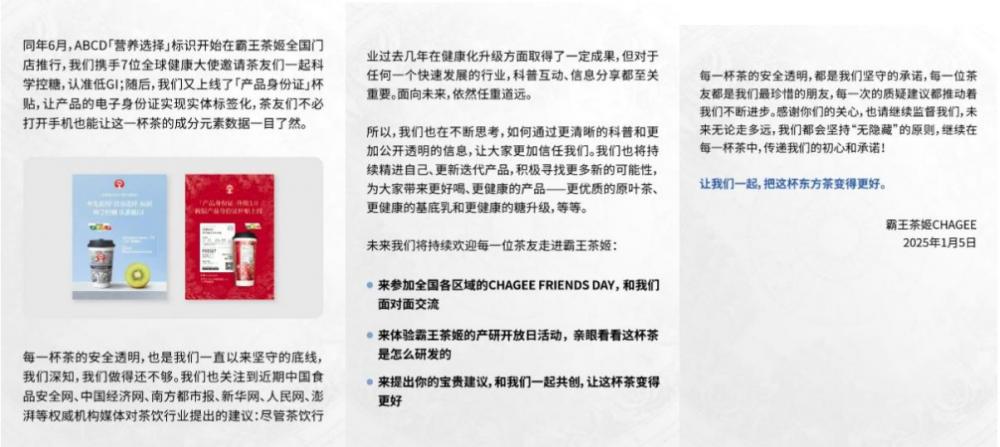 2022年,霸王茶姬公布了其明星产品“伯牙绝弦”的成分构成,并于2023年对产品成分进行了健康化升级。在这次回应中,霸王茶姬再次回顾、梳理了其产品成分,回应了用户的担忧:没有“科技狠活”,放心喝,将继续保持健康化、透明化。