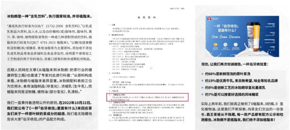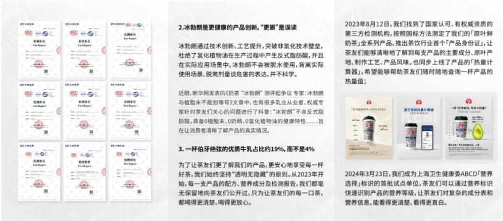 近日,奶茶行业因“冰勃朗”事件被推上风口浪尖。某评测博主录制了一期视频,评测了古茗、茶百道、喜茶、奈雪的茶、霸王茶姬、爷爷不泡茶、茉莉奶白、乐乐茶等12个头部奶茶品牌,认为奶茶中的“冰勃朗” 成分与植脂末存在相似之处,因此将冰勃朗称之为“科技乳”。这一观点迅速引发了消费者的讨论和担忧:冰勃朗是什么,奶茶还能喝吗?奶茶是不是“科技狠活”?作为新茶饮代表,今天,霸王茶姬在其官方渠道发布了《每一杯茶的安全透明,都是我们坚守的承诺》,通过问答形式解答了用户疑惑。