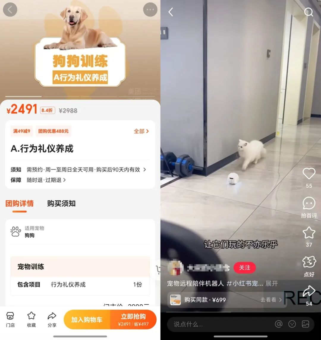 可以看到,很多养宠人已经在进行尝试:小红书上,宠物学校、日托班相关内容共计超过45万篇,宠物陪伴师和宠物陪伴机器人相关笔记数量接近4万篇。在淘宝等电商平台,宠物训练班、宠物陪伴机器人、以智能陪伴机器人为代表的宠物智能硬件,都常年畅销。