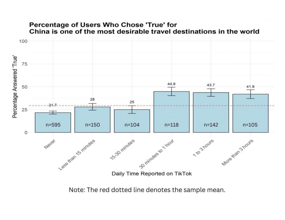 为验证该假设,研究机构通过在线平台召集了1214名美国成年受访者,了解他们的社交媒体使用强度,及对中国旅游的看法等。受访者需回答日均在Facebook、Instagram、TikTok等平台上浏览时长,同时需对“中国是世界上最令人向往的旅游目的地之一” 这一问题回答“是”或“否”。