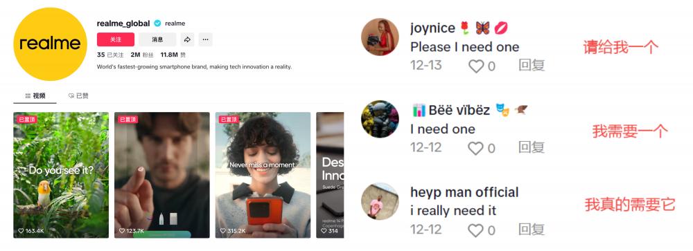 国产智能手机品牌realme也在TikTok上大放异彩。在其官方TikTok账号上,数条展示手机拍照能力的视频点赞量均突破10万,网友@arise满怀期待地留言:“希望我的圣诞礼物是realme”。