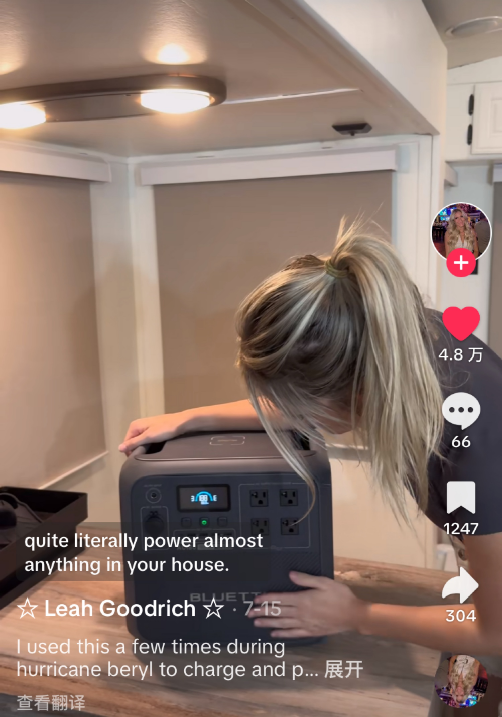 美国得克萨斯州女孩Leah是Bluetti的忠实用户。2024年初,Leah买了一辆房车,在TikTok上记录自己的户外生活,Bluetti的产品常常在她的视频中出镜。她夸张形容,这款产品必须随身携带,“有它在才能安心”。