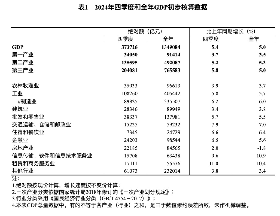据国家统计局消息,根据有关基础资料和国内生产总值(GDP)核算方法,经初步核算,我国2024年四季度和全年GDP核算结果如下。经初步核算,我国2024年全年GDP134.91万亿元,同比增长5%,金融业GDP同比增长5.6%,房地产业GDP同比下降1.8%。