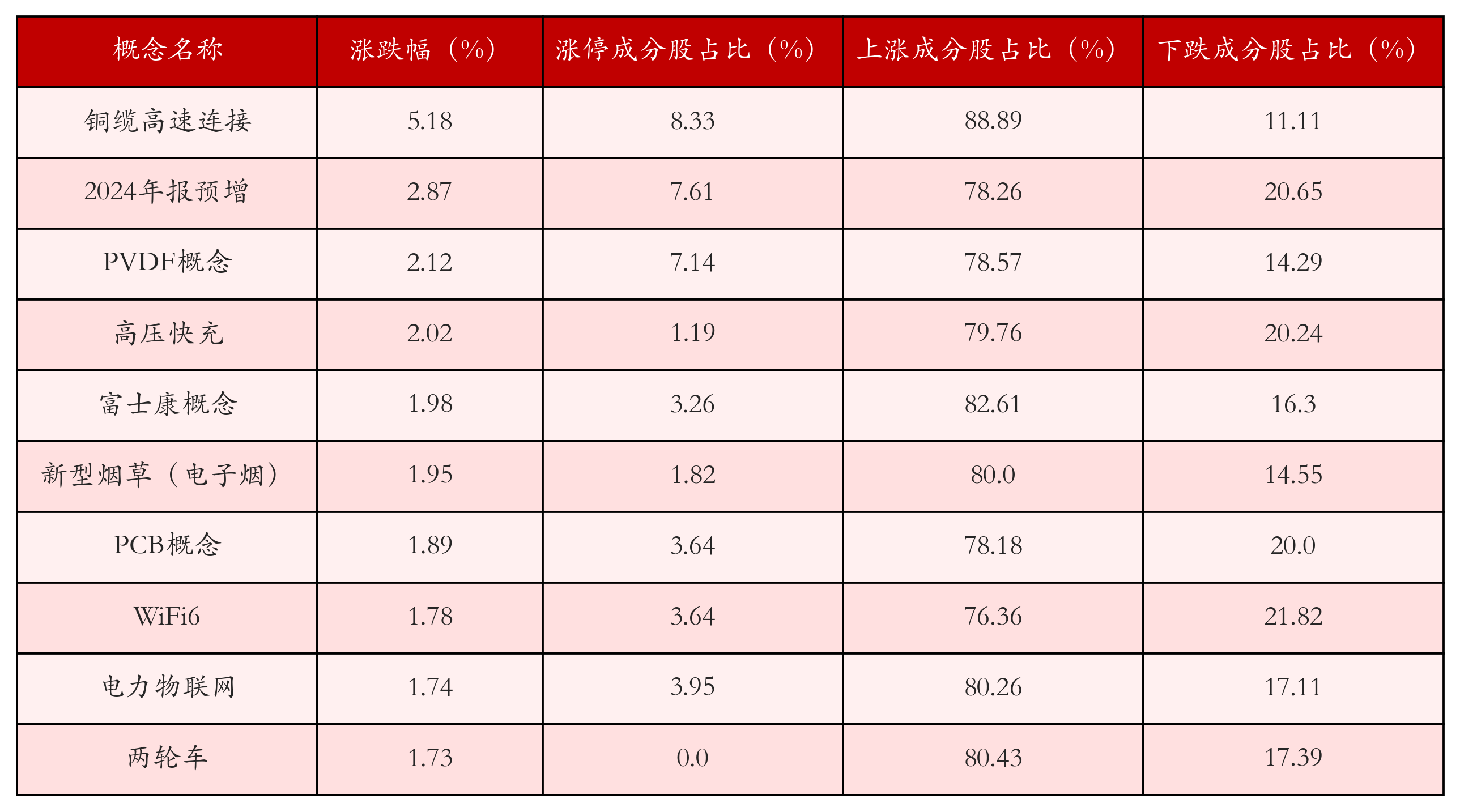 根据A股概念涨跌幅与所对应的股票池综合分析,涨幅靠前的三个概念板块分别为:铜缆高速连接、2024年报预增与PVDF概念。排名前10位的概念板块相关数据见下表: