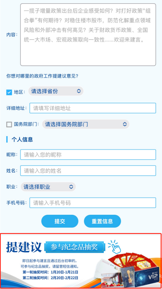 @全国网友 为政府工作报告提建议,即有机会抽取精美纪念品