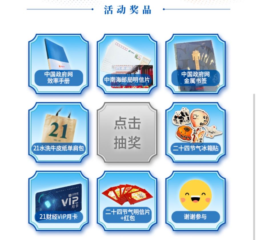 进入建言活动页面,填写并提交建言。收到抽奖资格确认的短信通知后,在抽奖活动期间,再次进入建言活动页面,点击“提交”按钮下方的活动入口图片即可参与抽奖(如下图,必须到21财经客户端内点击打开活动入口参与抽奖)。