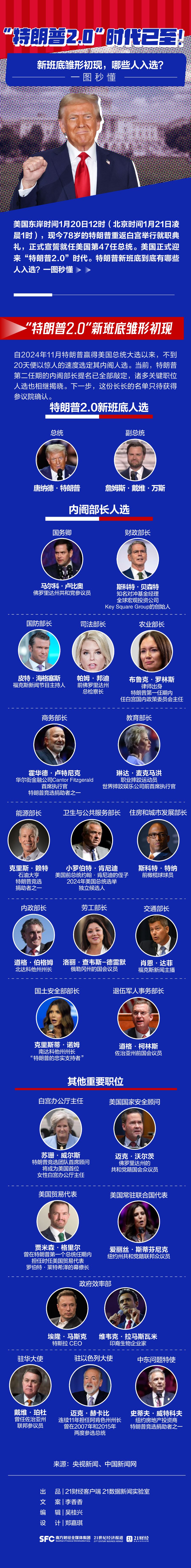 美国东岸时间1月20日12时(北京时间1月21日凌晨1时),现今78岁的特朗普重返白宫举行就职典礼,正式宣誓就任美国第47任总统。美国正式迎来“特朗普2.0时代”。特朗普新班底到底有哪些人入选?一图秒懂↓