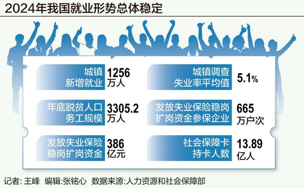2024年全国城镇新增就业1256万人,全年城镇调查失业率平均值为5.1%,就业形势总体稳定。